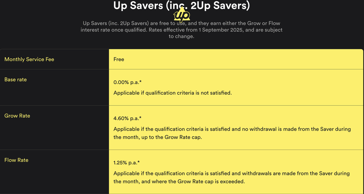 2025年9月1日開始,UP Bank 修改了以往了年利率優惠方案,從原本的3.85% p.a.調漲至4.6%年利率,非常的不錯,因為你不需要承擔任何虧損的風險也不用買股票和ETF,錢放在那邊就能領到穩定的被動收入。